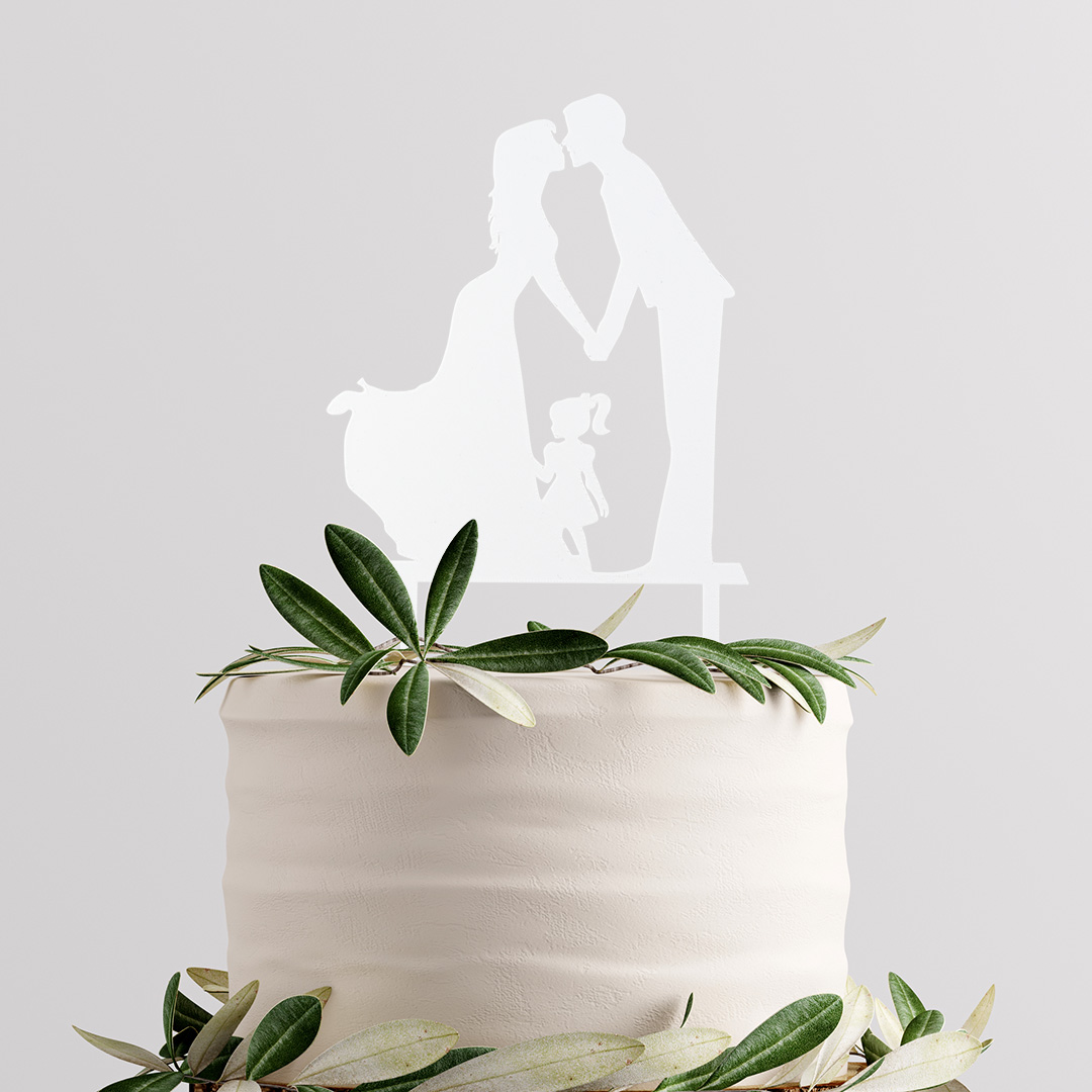 Svadobný zápich so siluetou novomanželov a malého dievčatka je nežným symbolom spojenia rodiny.