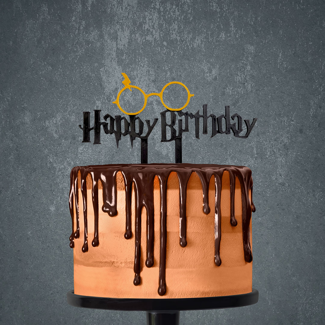 Zápich na tortu s ikonickými okuliarmi, bleskom a nápisom „Happy Birthday“ okamžite navodí atmosféru čarodejníckeho sveta.