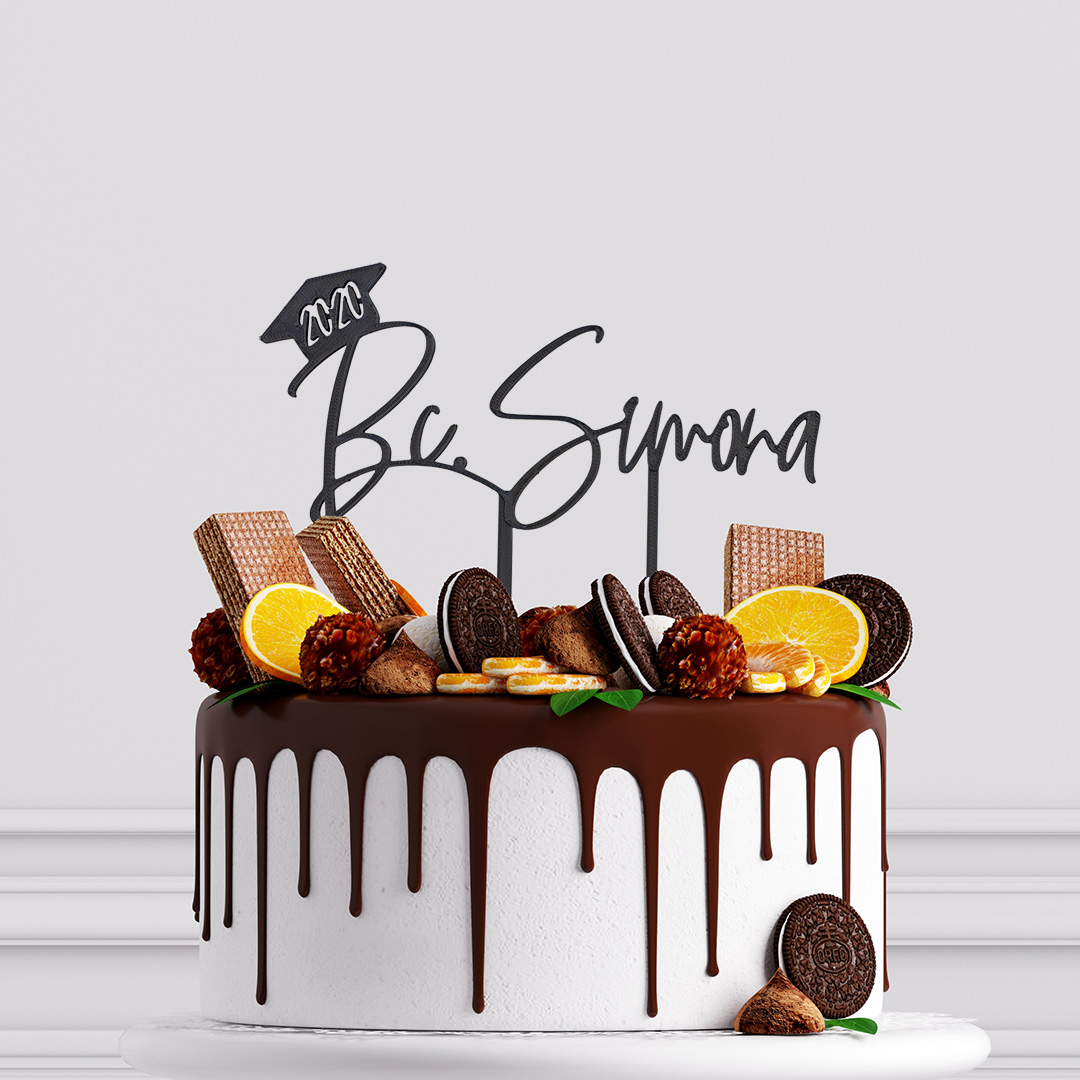 Elegantný zápich s menom a titulom je štýlovou dekoráciou na tortu pri oslave ukončenia štúdia. Jemné rukopisné písmo doplnené promočnou čiapkou vytvára moderný a slávnostný dizajn, ktorý dokonale vystihuje atmosféru promócií. Stačí jeden detail a torta sa okamžite premení na tematický stredobod celej oslavy.