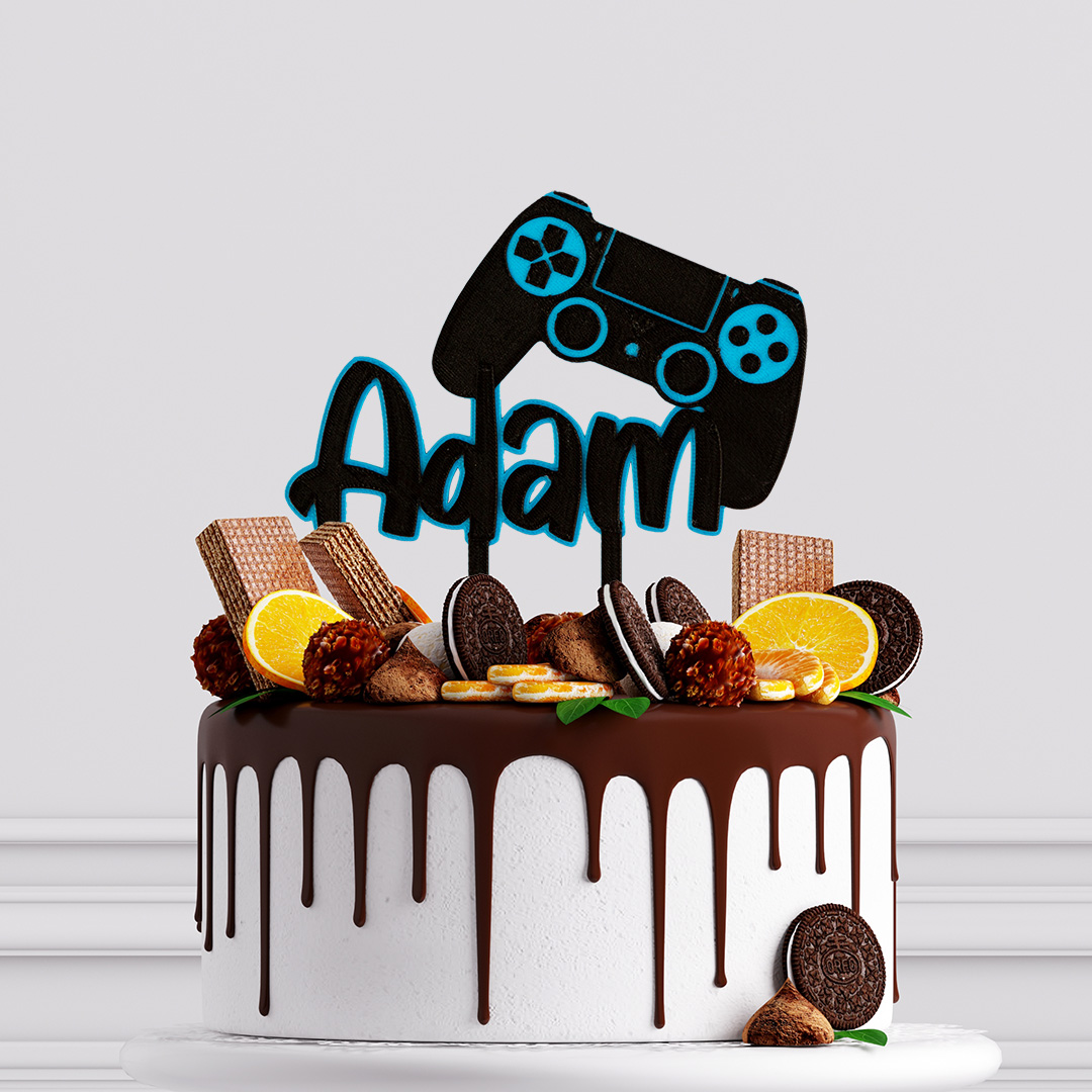 Zápich s motívom herného ovládača PlayStation a menom oslávenca je výrazným doplnkom narodeninovej torty pre fanúšikov konzolových hier.