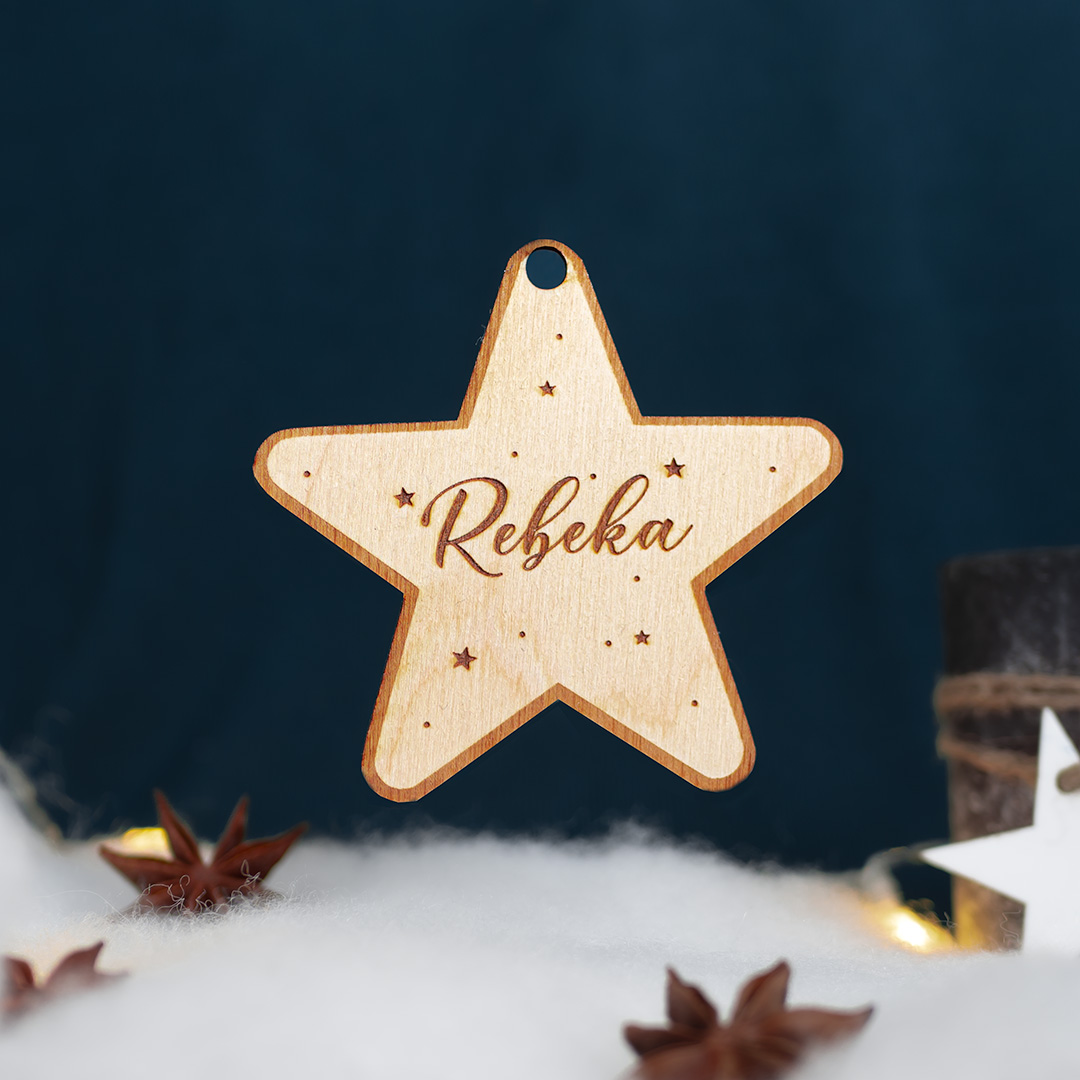 Vianočná hviezda s vygravírovaným menom, dozdobená malými gravírovanými hviezdičkami.