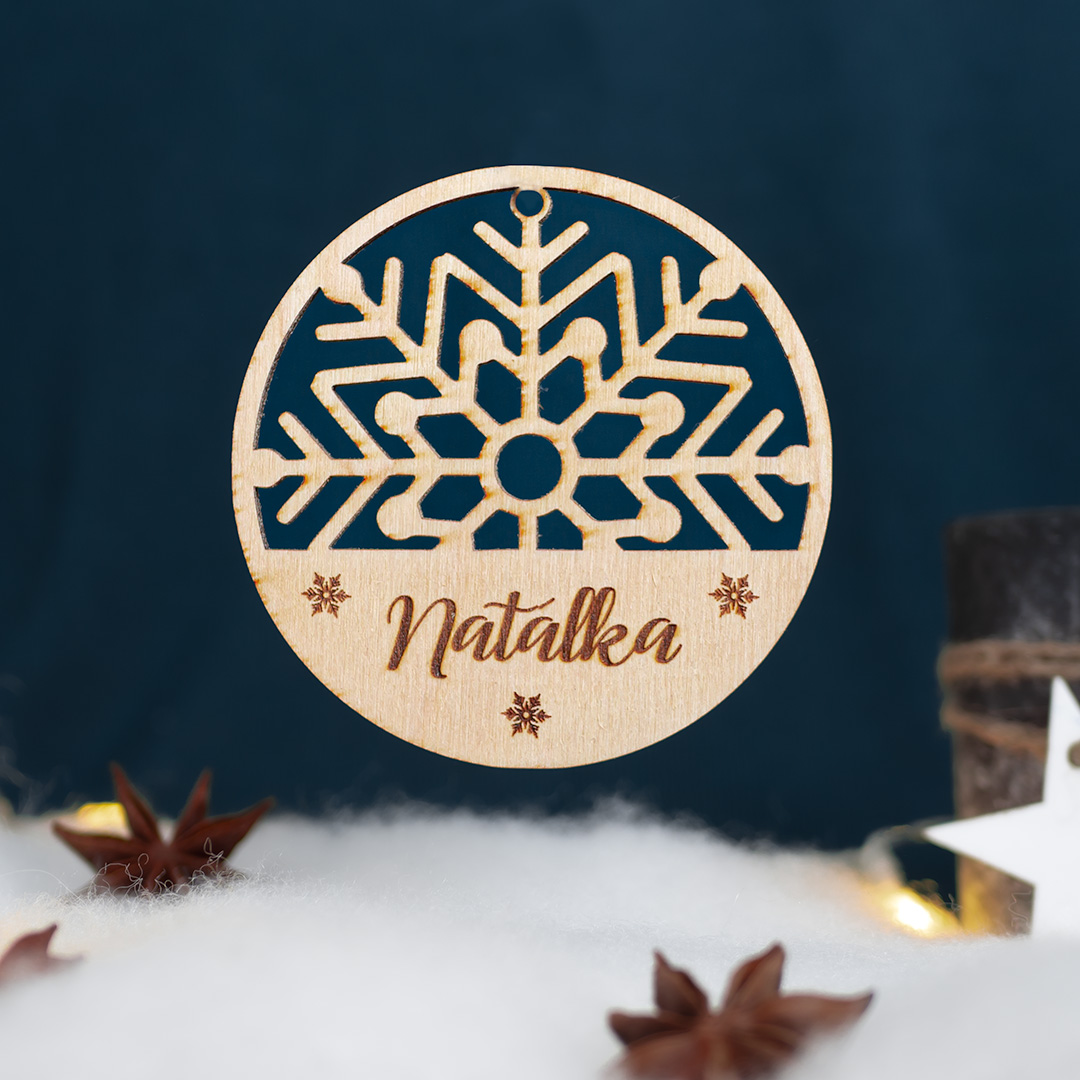 Drevená vianočná ozdoba s vlastným menom. Ozdoba je v tvare kruhu, v ktorom je vyobrazená vločka a vygravírované vami zvolené meno.