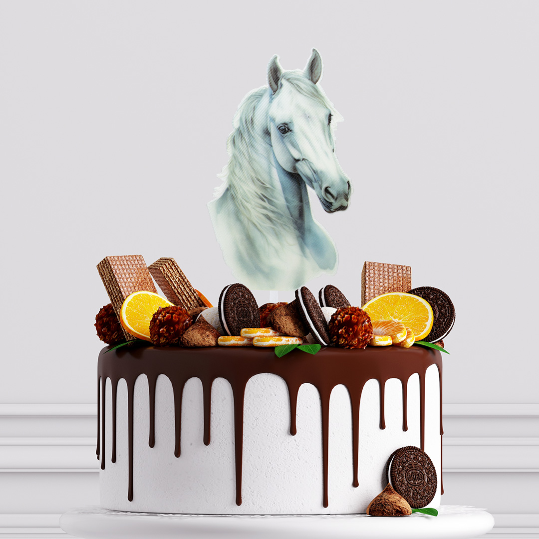 Obrázkový zápich s realistickým motívom bieleho koňa je nádherným doplnkom na každú tortu pre milovníkov koní. Detailné spracovanie a jemné farebné tóny vytvárajú štýlovú dekoráciu, ktorá zaujme na prvý pohľad.