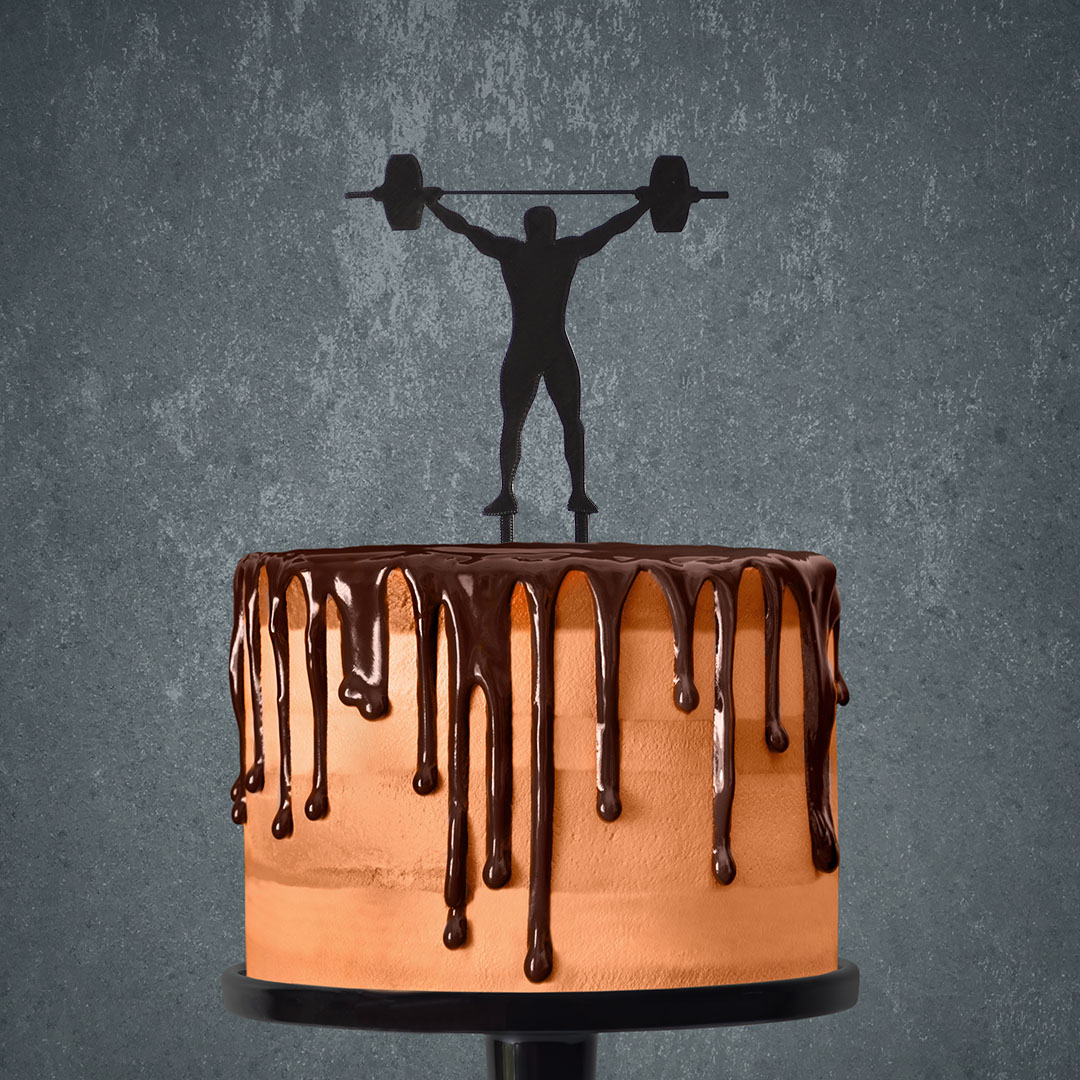 Zápich na tortu so siluetou kulturistu s činkou je výrazným prvkom pre oslavy ľudí, ktorí milujú silový tréning, fitness a výzvy.