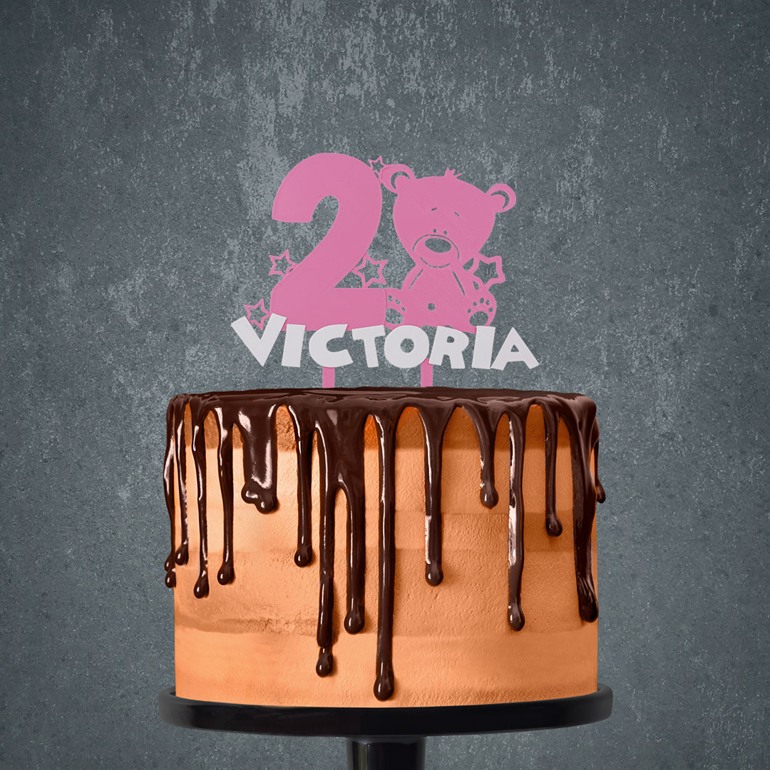 Roztomilý zápich s mackom, veľkou číslicou 2 a menom oslávenca je ideálnym doplnkom na tortu pre každé malé dieťa. Hravý motív plný hviezdičiek dodá oslave veselý a nežný charakter.