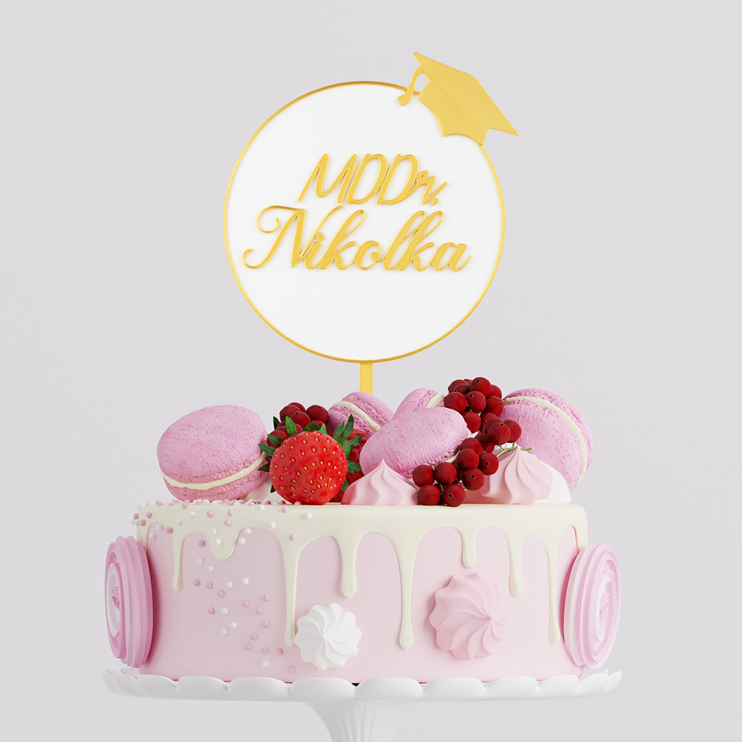 Elegantný kruhový zápich s titulom MDDr. a menom absolventa je štýlovým detailom, ktorý dodá slávnostnej torte osobný a reprezentatívny charakter.