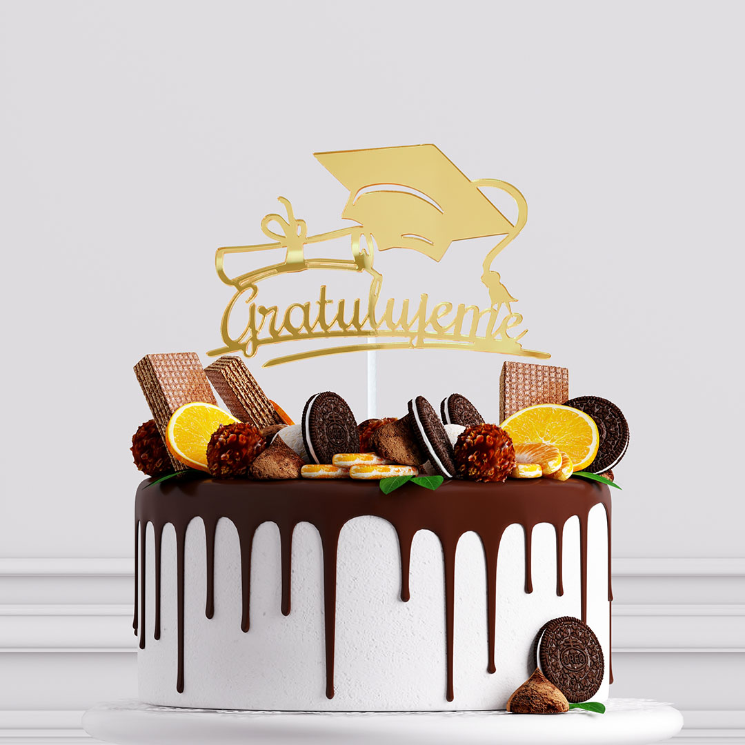 Zrkadlový zápich s nápisom „Gratulujeme", promočnou čiapkou a diplomom dodá slávnostnej torte reprezentatívny charakter, ktorý presne sedí k tomuto výnimočnému dňu.