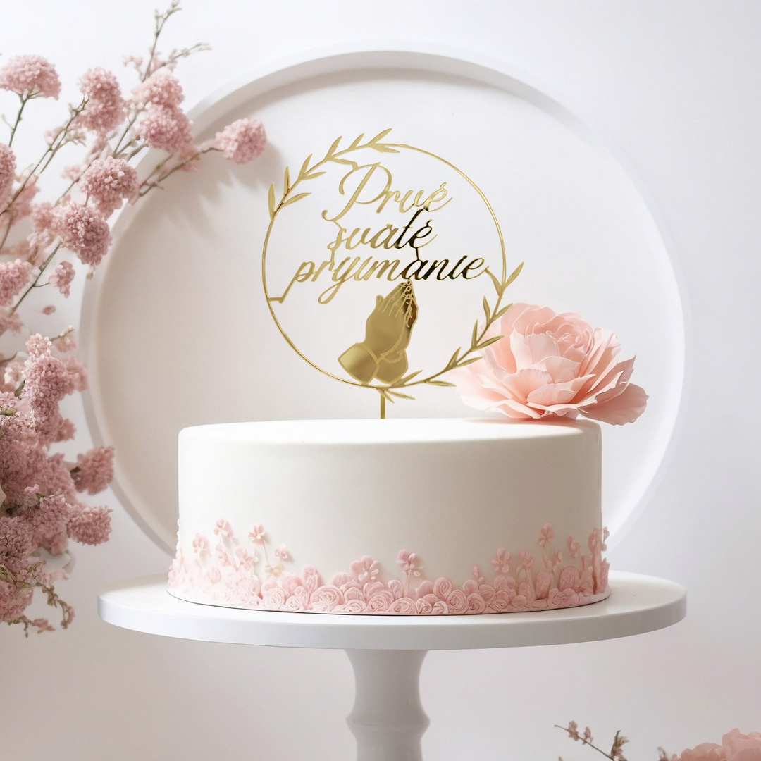 Slávnostný zrkadlový zápich s nápisom „Prvé sväté prijímanie“ v ozdobnom kruhu je elegantnou dekoráciou na tortu pri tejto výnimočnej udalosti. Motív modliacich sa rúk doplnený jemnými vetvičkami pôsobí dôstojne a duchovne. Vďaka lesklému akrylovému materiálu vytvára zápich krásny zrkadlový efekt, ktorý dodá torte noblesný a sviatočný vzhľad.